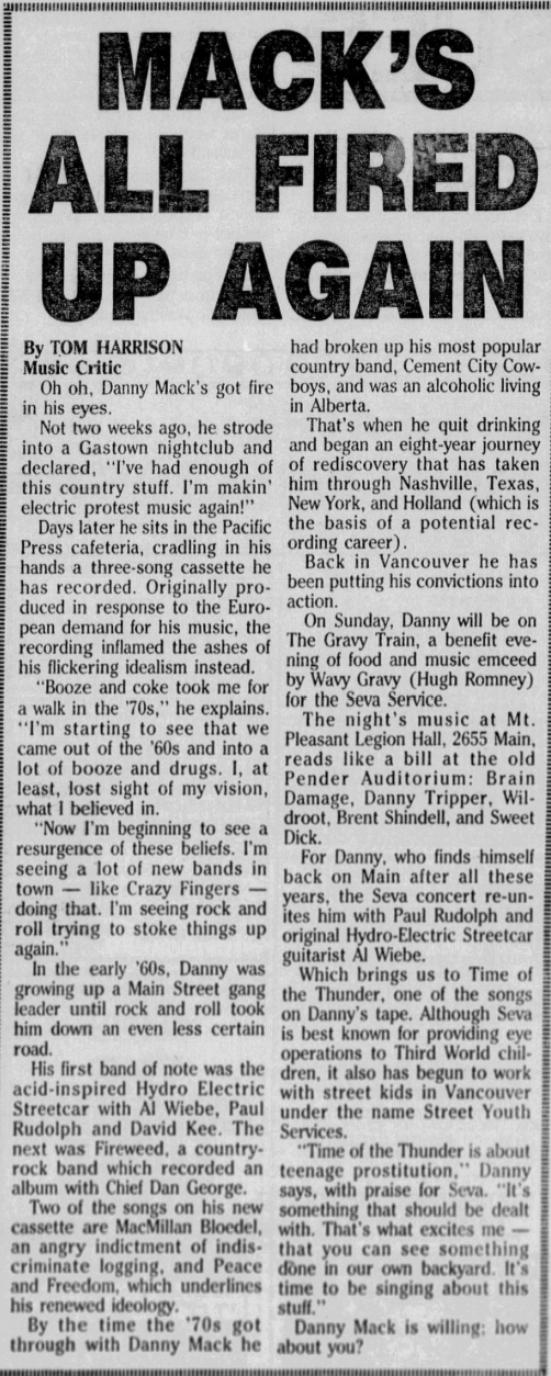 Hydro Electric Streetcar The Vancouver Province, February 3, 1988 See also Danny Mack, Cement City Cowboys